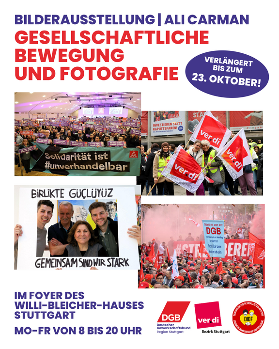 Noch bis zum 23. Oktober 2025 können die Bilder von Ali Carman im Foyer des Willi-Bleicher-Hauses Stuttgart besucht werden. Der Eintritt ist kostenlos und das Haus von Montag bis Freitag von 8 bis 20 Uhr geöffnet.