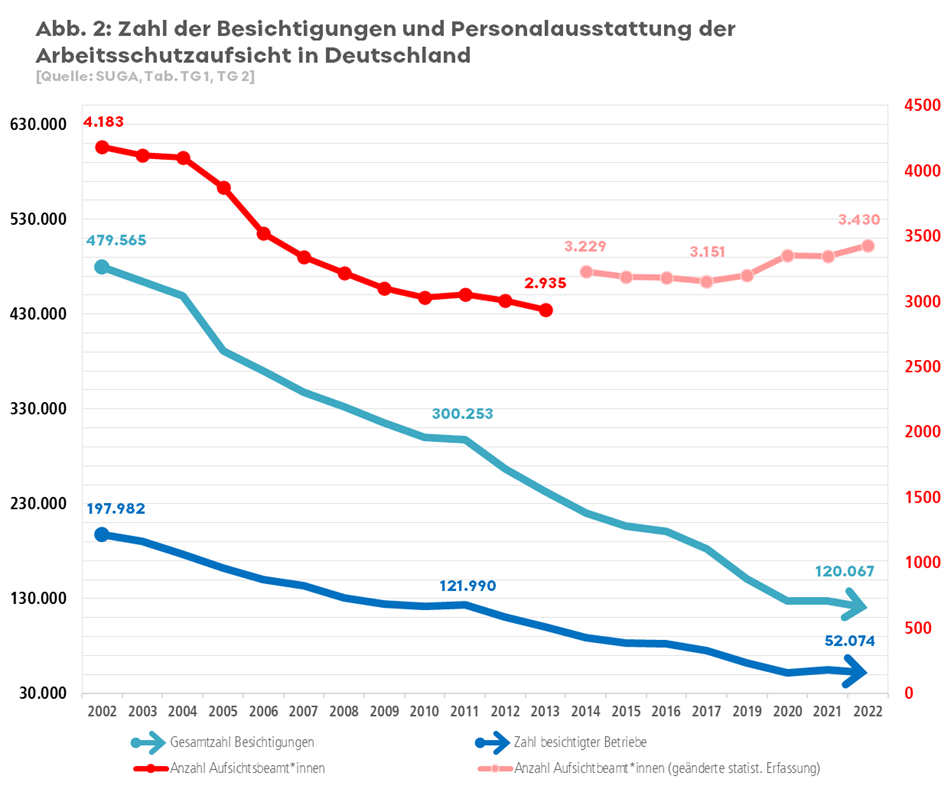 In Deutschland ist die Zahl der Betriebsbesichtigungen durch die Arbeitsschutzaufsicht von 479.565 im Jahr 2002 auf 120.067 im Jahr 2022 gesunken. Das entspricht einem Rückgang um 75 Prozent. 52.074 unterschiedliche Betriebe wurden 2022 von der Arbeitsschutzaufsicht kontrolliert. 2002 waren es noch 197.982, der Wert sank also um 73,7 % (siehe Abb. 2).