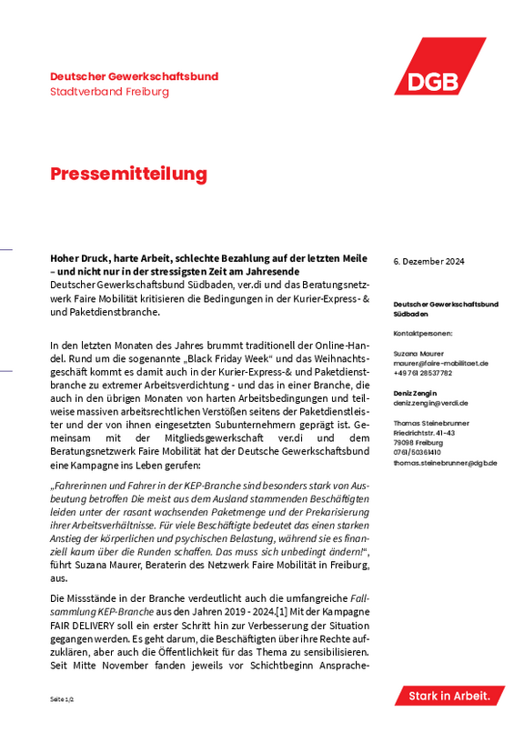 Deutscher Gewerkschaftsbund Südbaden, ver.di und das Beratungsnetzwerk Faire Mobilität kritisieren die Bedingungen in der Kurier-Express- & und Paketdienstbranche.