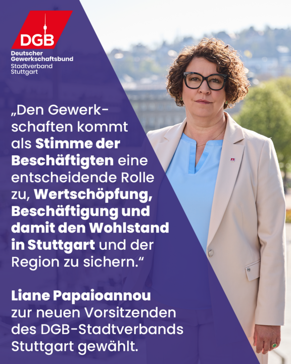 Liane Papaioannou, Erste Bevollmächtigte der IG Metall Stuttgart, ist am Dienstag zur neuen Vorsitzenden des DGB-Stadtverband in Stuttgart gewählt worden. Sie folgt auf Udo Lutz, der nicht nochmals angetreten war.